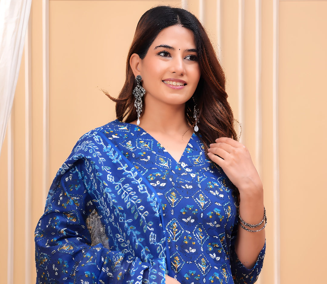 Women's Indigo Ethnic Wear Print Cotton Kurta With Bottomwear